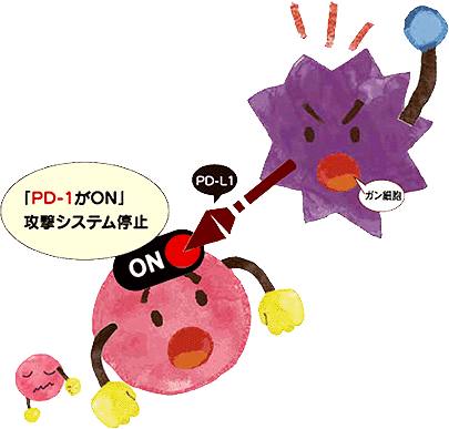 生体内には通常、免疫システムの一つである「T細胞」の働きでガン細胞を異物とみなし排除する機能があります。しかし、免疫システムの「T細胞」には自身の過剰な働きを抑えるためのブレーキ機能のスイッチ「PD-1」があり、ガン細胞は「PD-L1」という分子を作り出して「PD-1」のスイッチをONにしてガン細胞への攻撃を逃れて増殖しながら進行します。 |